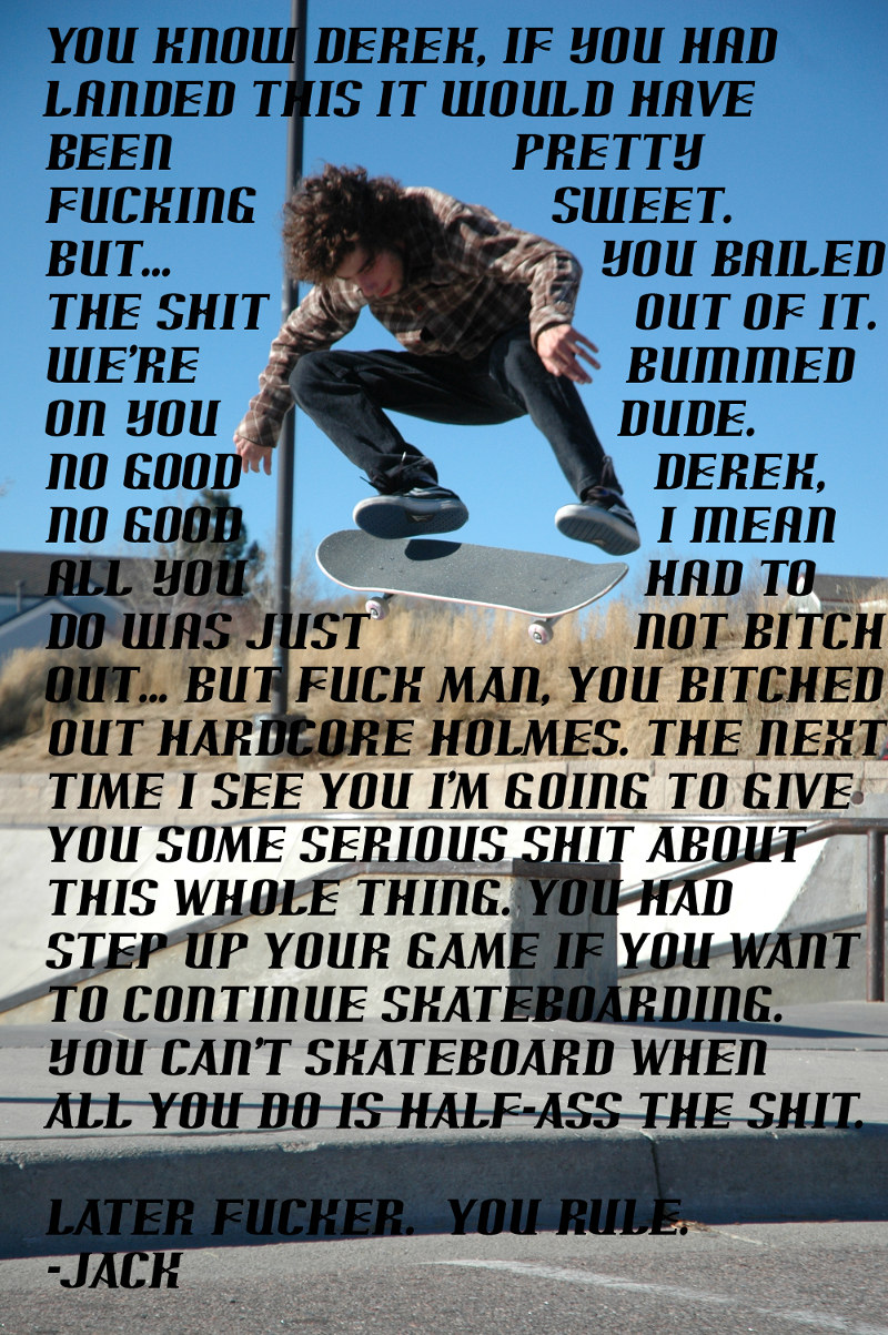 Some Nullers call each other, some text, email, facebook, whatever. But here Jack raises the bar by trash talking to Derek through text on a bail photo. Should have landed it Derek.