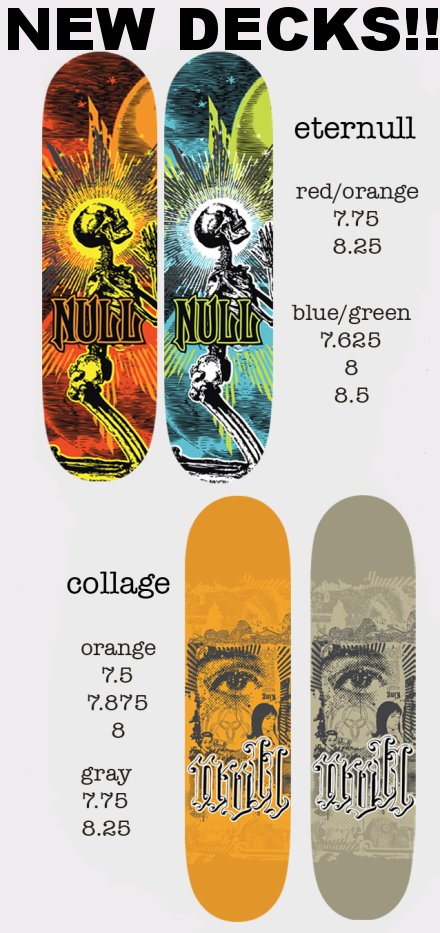 We just got in two new graphics and a new colorway of the Eternull deck. This is one of the new graphics (obviously) that we’re calling the Nullentology Deck. This graphic was done by Boulder skater/artist Matt Schreiber and is still the same great USA made wood our boards are known for. We’ll get the rest of the new decks online shortly.